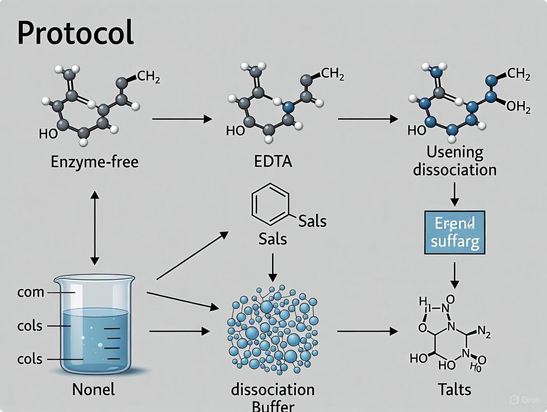 This article provides a comprehensive guide to enzyme-free cell dissociation, a gentle technique crucial for applications requiring intact cell surface proteins and high viability, such as single-cell analysis, stem cell research, and drug development. It covers the foundational principles of how non-enzymatic buffers work, detailed step-by-step protocols for adherent cell lines and sensitive pluripotent stem cells, common troubleshooting and optimization strategies, and a comparative analysis with traditional enzymatic methods. The content is tailored for researchers, scientists, and drug development professionals seeking to implement robust, reproducible, and gentle cell dissociation in their workflows.