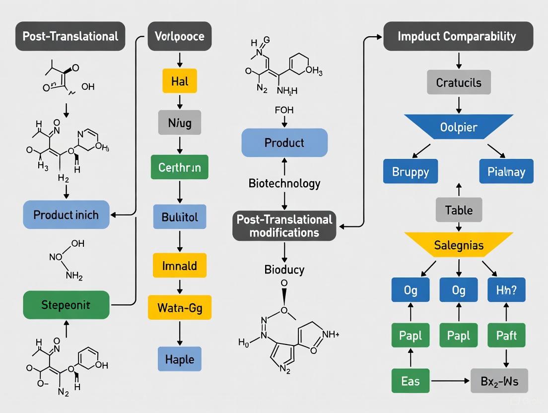 The connection between PTMs and CQAs is particularly critical in the context of product comparability research, where manufacturers must demonstrate that changes in the manufacturing process do not adversely affect the safety or efficacy of the drug product. Since PTMs are highly sensitive to production conditions, including cell culture parameters, nutrient availability, and downstream processing, they often serve as key indicators of product consistency and quality [21] [18]. A thorough understanding of how specific PTMs influence CQAs enables manufacturers to implement science-based control strategies that maintain product quality while allowing for necessary process improvements.